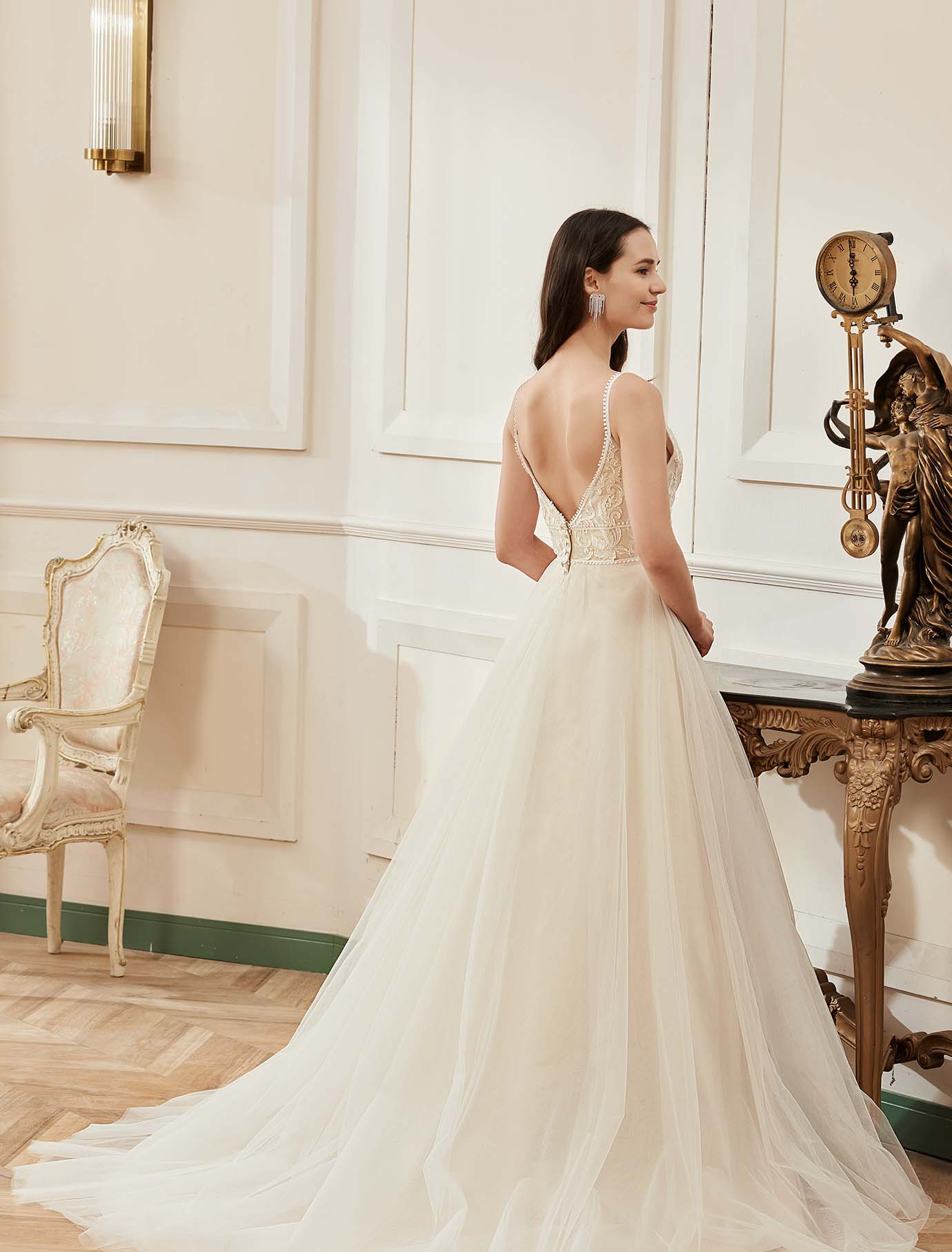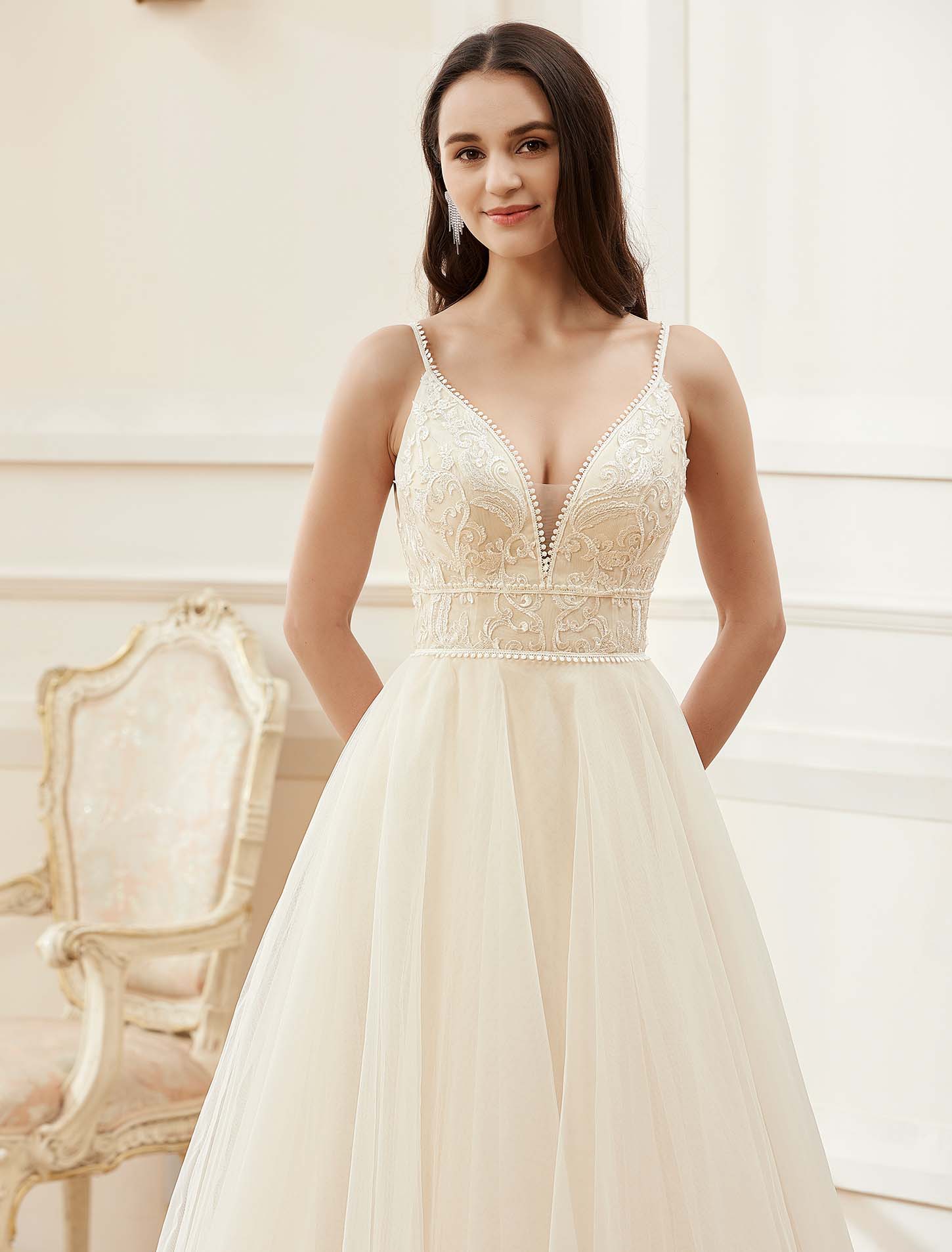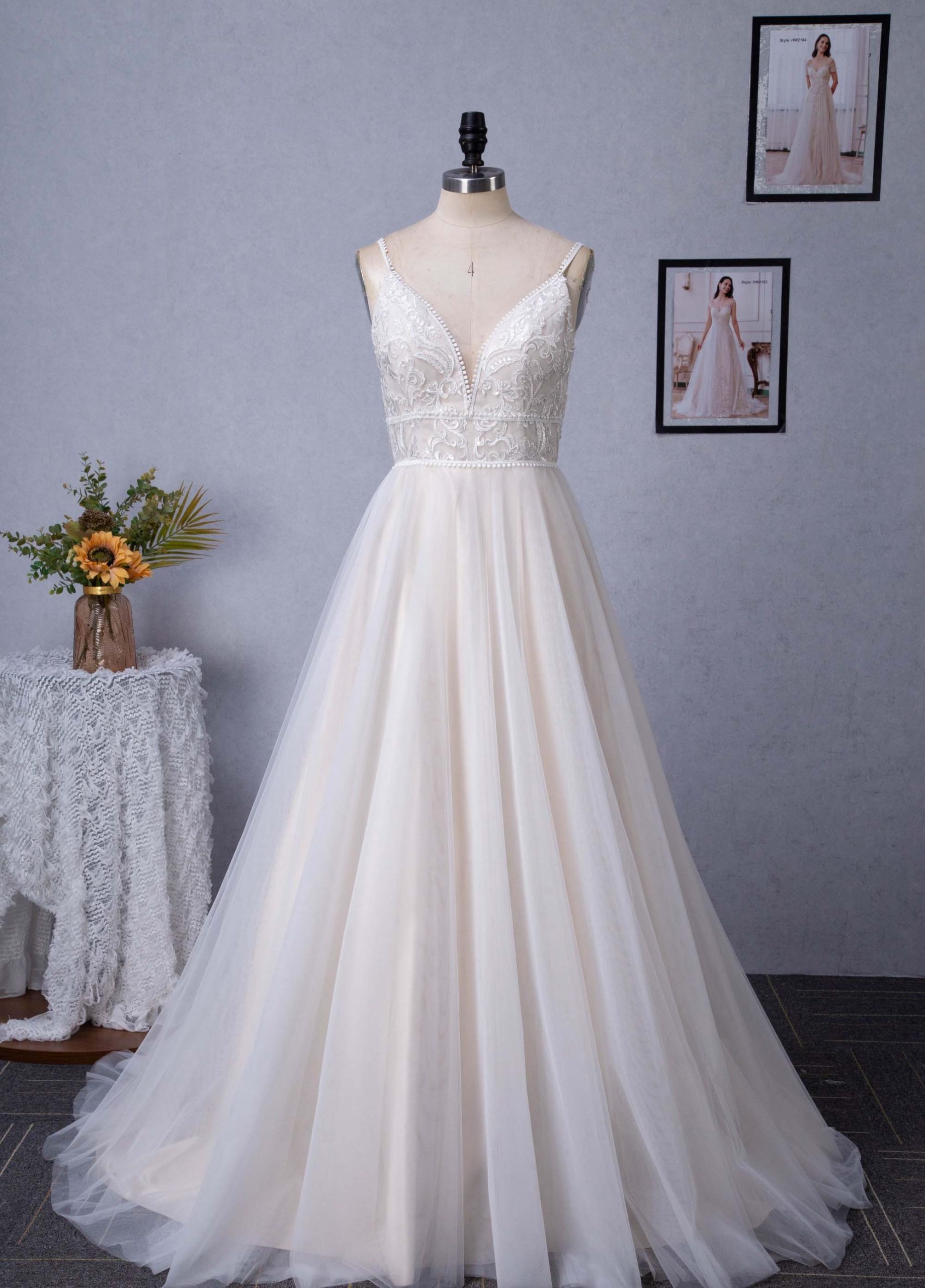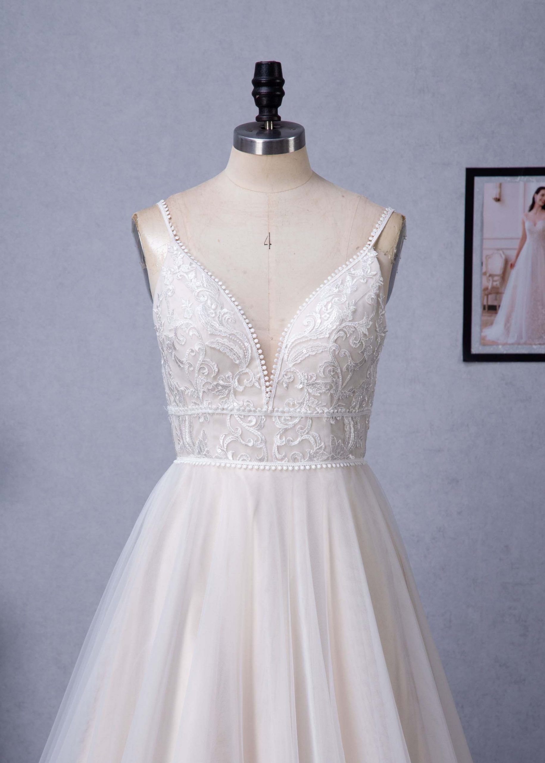 Look like a vision in our newest style, Ray. This dress features a lace bodice, a low V neckline, and a flowy tulle skirt. The plunging V neckline has lace details and a sheer insert. The spaghetti strap extends into the low V back of the dress which has buttons. The midriff is detailed with lace edgings, accentuating the fit of the dress. The dress flares out from the bodice into a flowy pleated tulle skirt, which ends with a chapel train. The champagne satin lining gives the dress a luxurious and comfortable feel. The dress is inspired by bohemiann brides looking for their dream wedding gown.