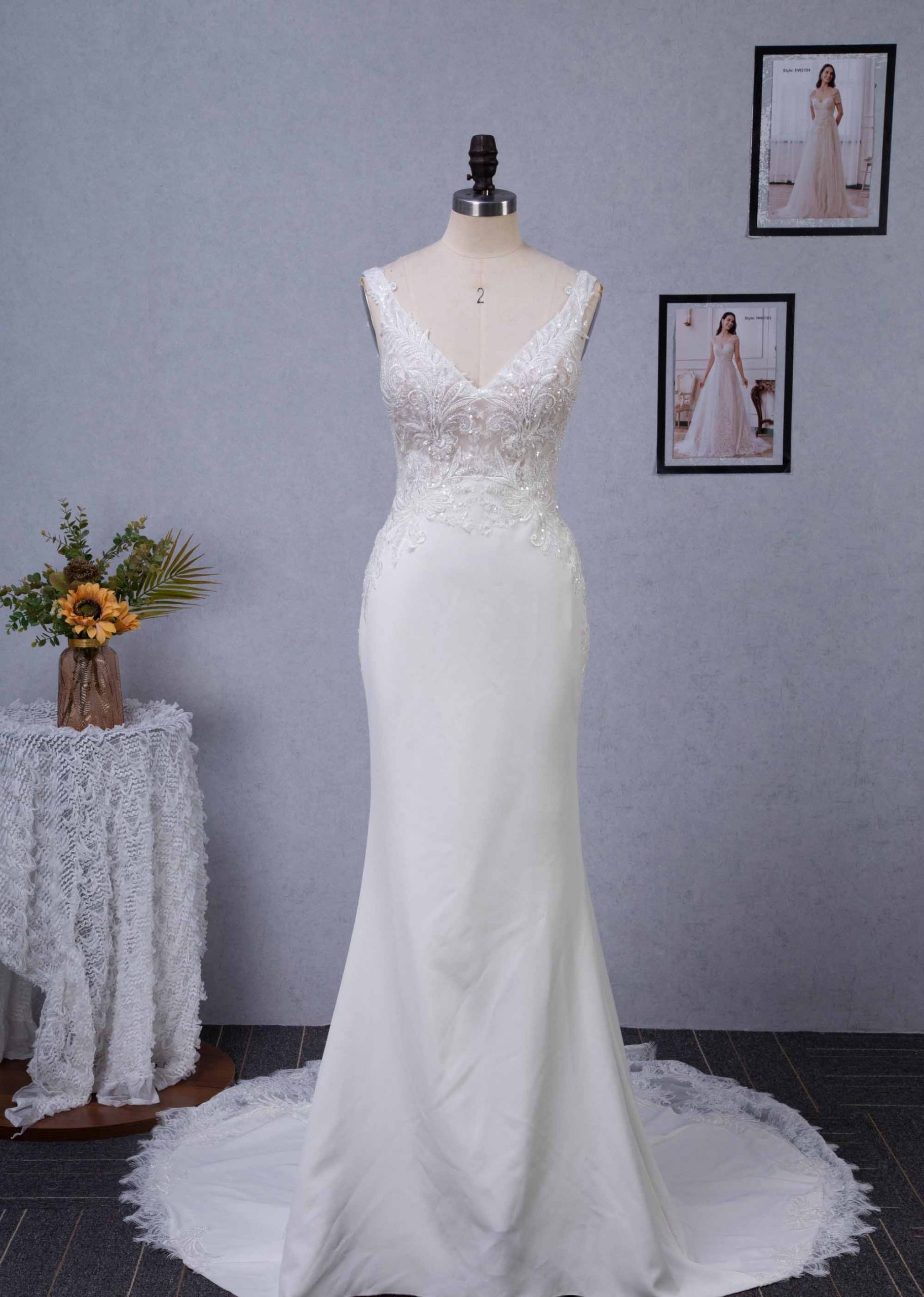 Combining sheer lace with luscious crepe fabric, this dress is perfect for outdoor and intimate weddings. The sheer lace bodice is elaborated with an intricate lace pattern and lovely beadings on the front and the back of the dress. The illusion straps extend into the V back of the dress, which contains invisible zippers and buttons. The soft crepe fabric of the dress hugs all the right curves and ends into a court train. The hemline of the skirt is edged with the finest lace pattern that runs up onto the skirt.