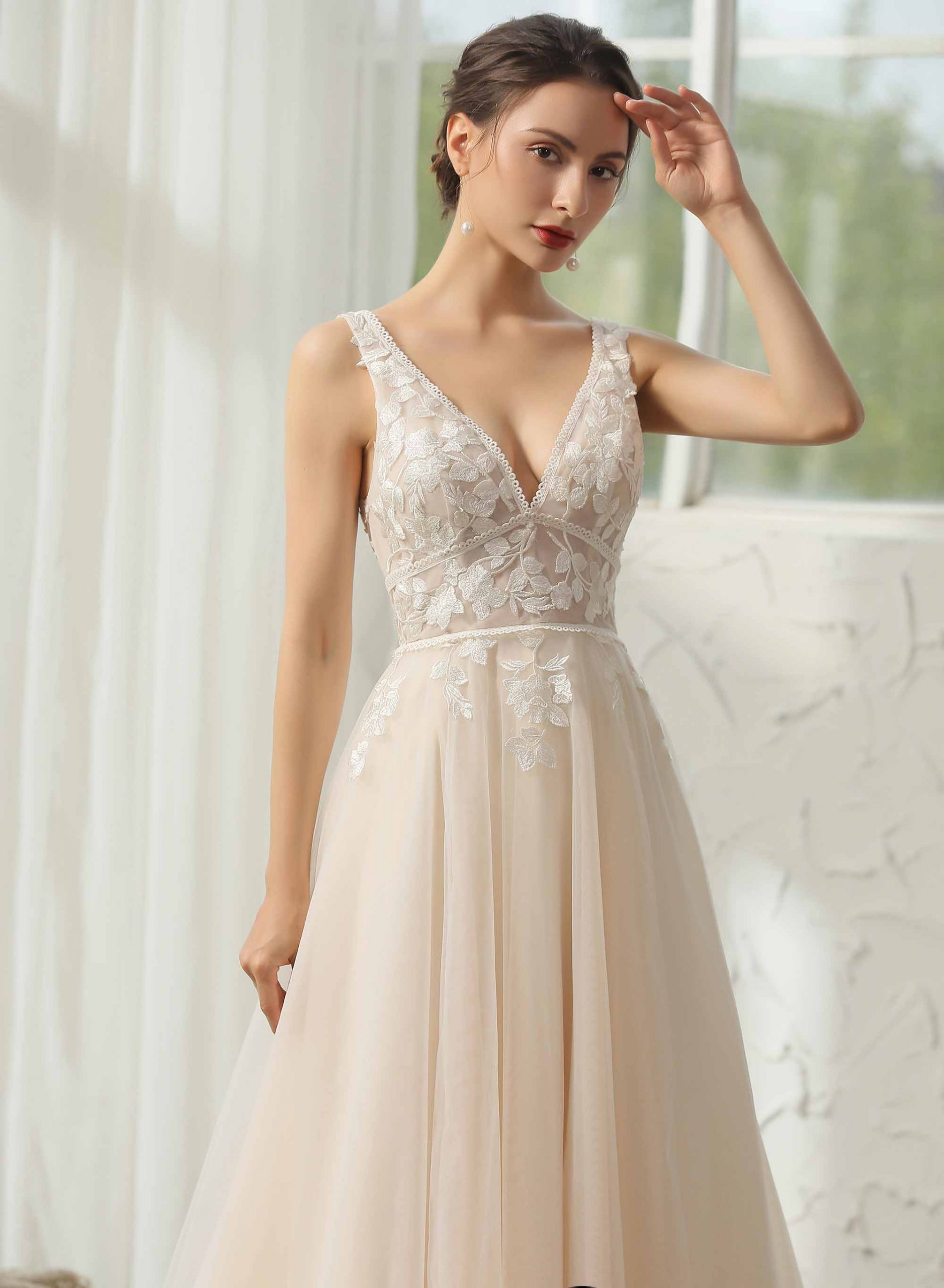 Crafted with perfection, this dress is both bold and elegant. Large floral appliques beautify the bodice of the gown, with lace edgings along the neckline and the midriff. The blush tulle skirt adds to the elegance and quirkiness of this boho-inspired dress. With multiple layers of the tulle skirt, it ends in a chapel train. The floral details cascade down from the bodice of the dress to the skirt of the dress. The dress is supported by invisible zippers and buttons, which provide a unique silhouette to the dress.